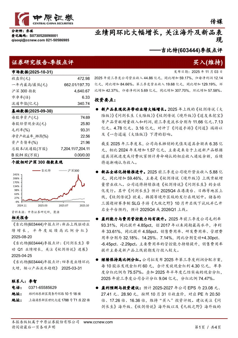 吉比特:中原证券-吉比特-603444-季报点评:业绩同环比大幅增长,关注海外及新品表现-251103