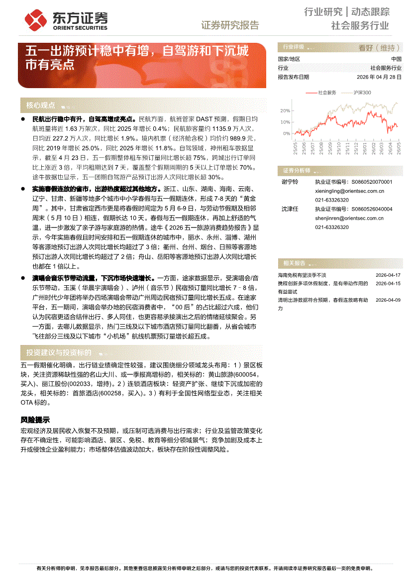 社会服务行业:东方证券-社会服务行业动态跟踪:五一出游预计稳中有增,自驾游和下沉城市有亮点-260428