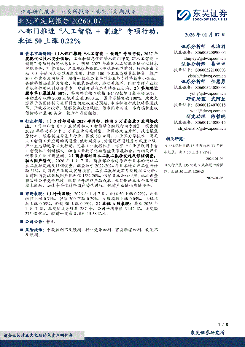 东吴证券-北交所定期报告:八部门推进“人工智能+制造”专项行动,北证50上涨0.22%-260107