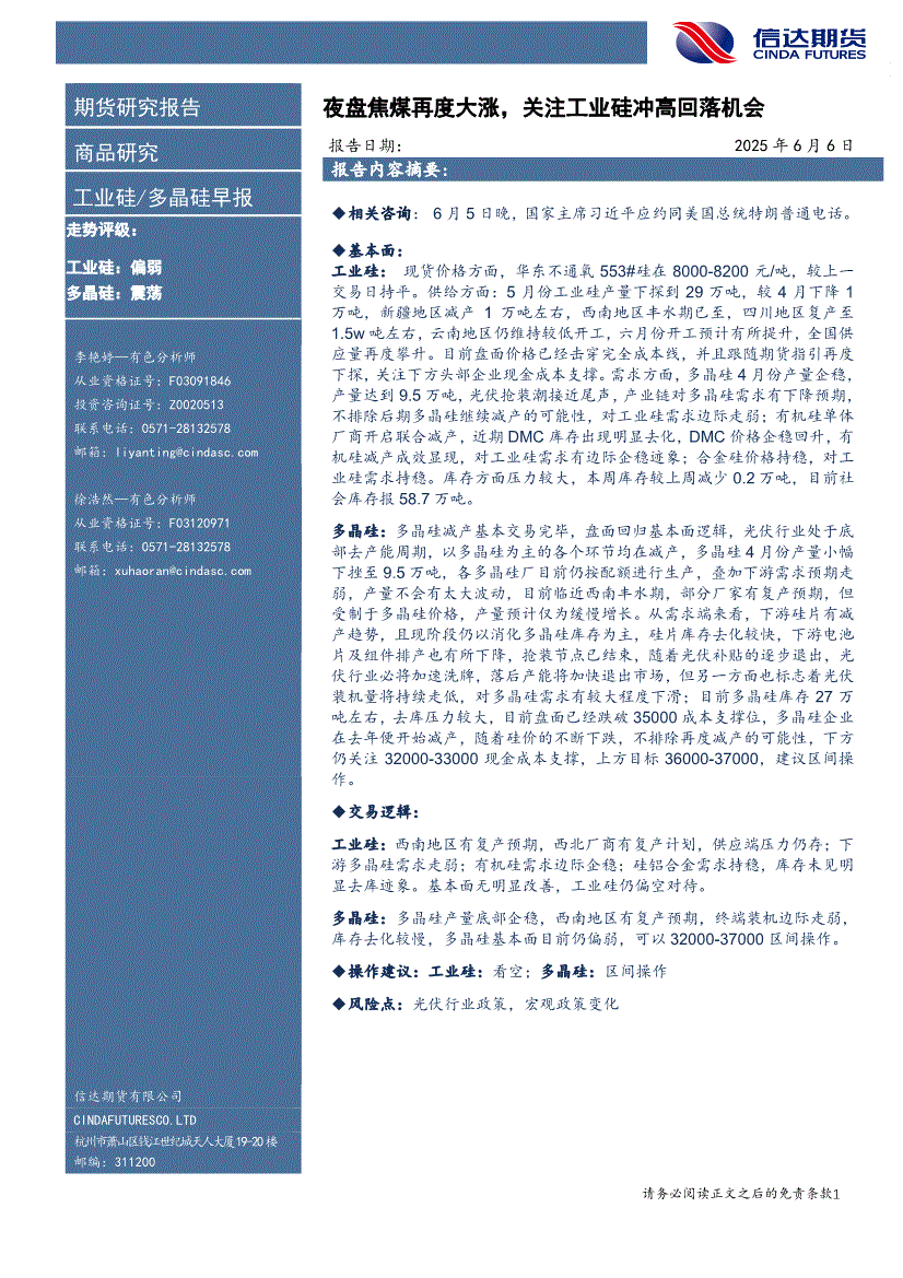 信达期货-工业硅/多晶硅早报:夜盘焦煤再度大涨,关注工业硅冲高回落机会-250606