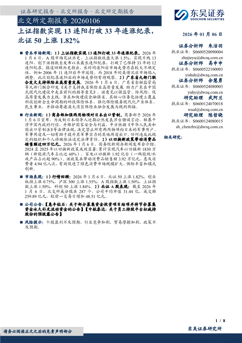 东吴证券-北交所定期报告:上证指数实现13连阳打破33年连涨纪录,北证50上涨1.82%-260106