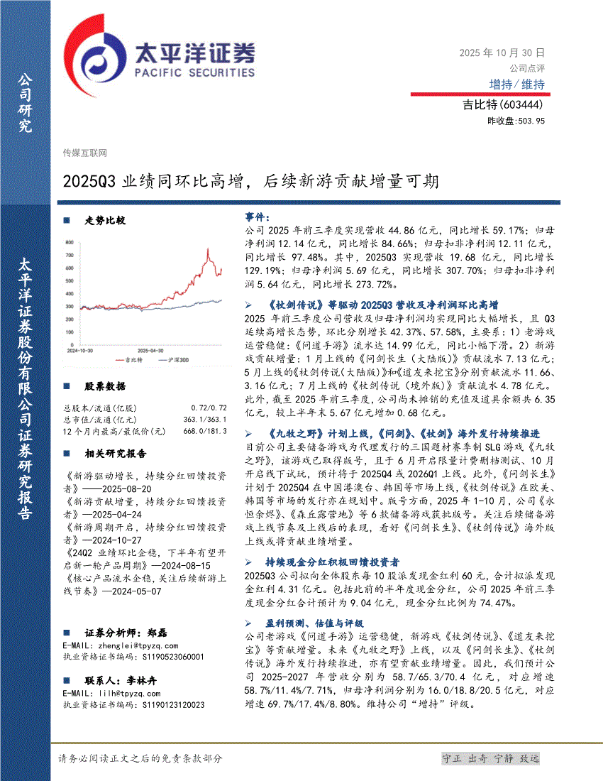 吉比特:太平洋证券-吉比特-603444-2025Q3业绩同环比高增,后续新游贡献增量可期-251030