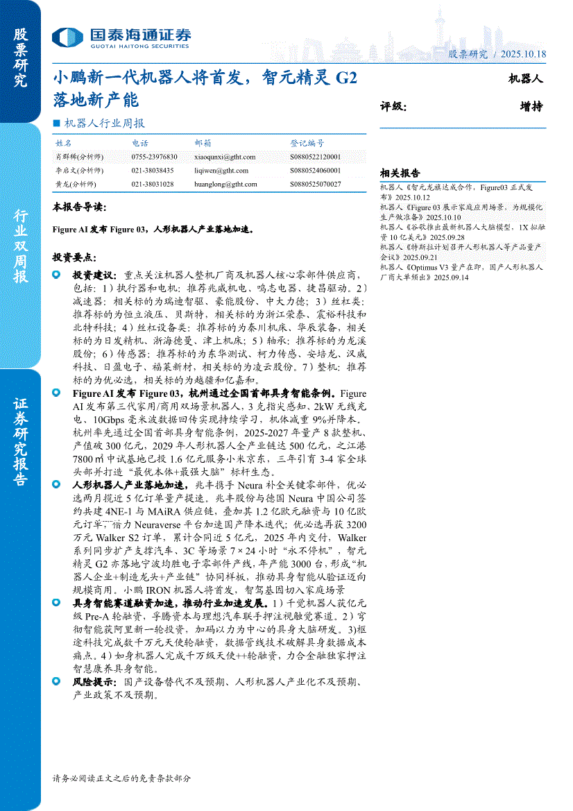 机器人行业:国泰海通证券-机器人行业周报:小鹏新一代机器人将首发,智元精灵G2落地新产能-251018