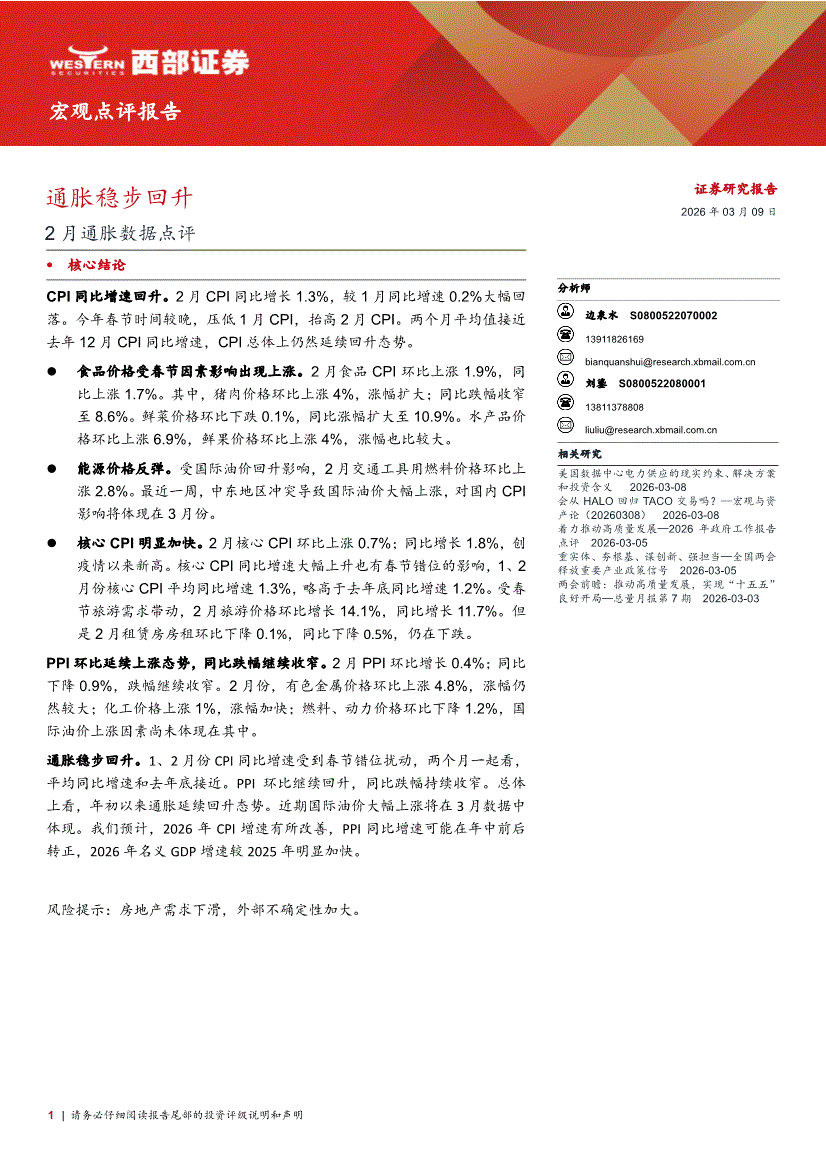 西部证券-2月通胀数据点评:通胀稳步回升-260309