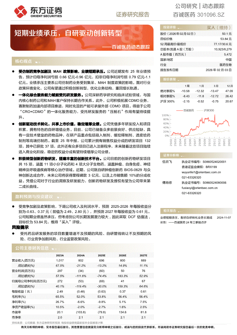 百诚医药:东方证券-百诚医药-301096-动态跟踪:短期业绩承压,自研驱动创新转型-260203