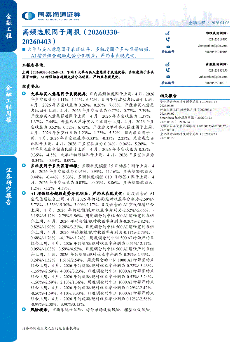 国泰海通证券-高频选股因子周报:大单与买入意愿因子表现优异,多粒度因子多头显著回撤。AI增强组合超额走势分化明显,严约束表现更优-260406
