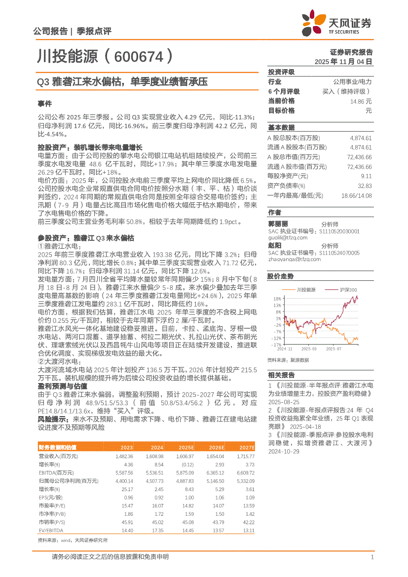川投能源:天风证券-川投能源-600674-Q3雅砻江来水偏枯,单季度业绩暂承压-251104
