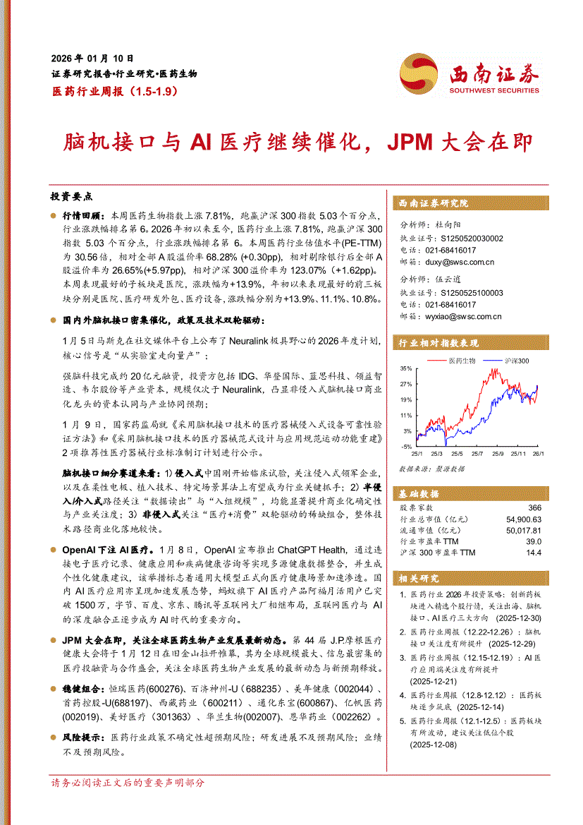 医药行业:西南证券-医药行业周报:脑机接口与AI医疗继续催化,JPM大会在即-260110
