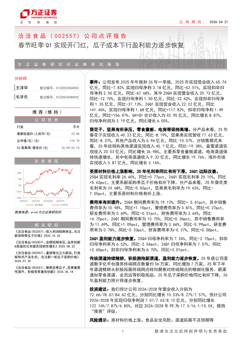 洽洽食品:方正证券-洽洽食品-002557-公司点评报告:春节旺季Q1实现开门红,瓜子成本下行盈利能力逐步恢复-260421