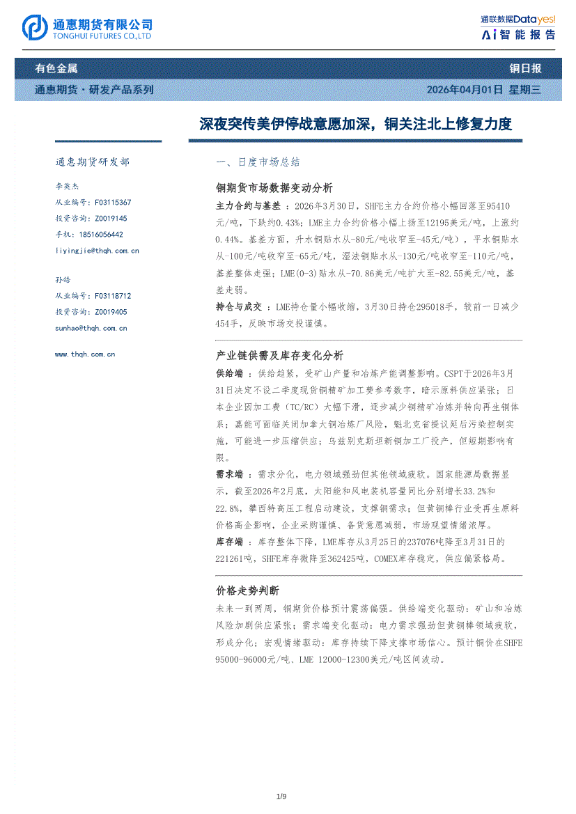 通惠期货-铜日报:深夜突传美伊停战意愿加深,铜关注北上修复力度-260401