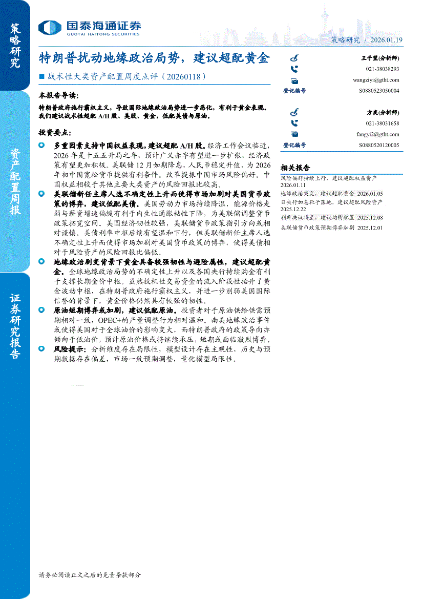 国泰海通证券-战术性大类资产配置周度点评:特朗普扰动地缘政治局势,建议超配黄金-260119