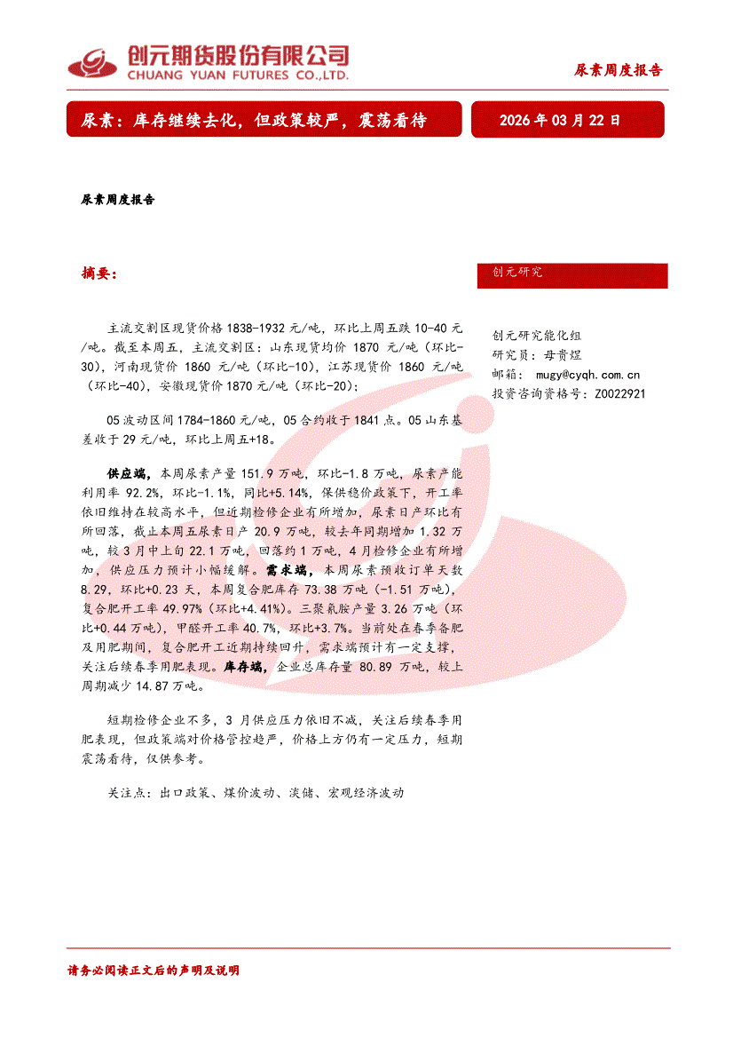 创元期货-尿素周度报告:库存继续去化,但政策较严,震荡看待-260322