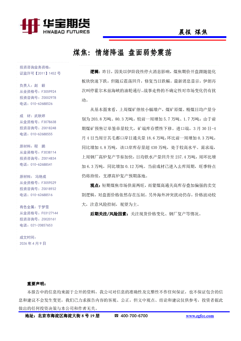 华宝期货-煤焦:情绪降温,盘面弱势震荡-260409