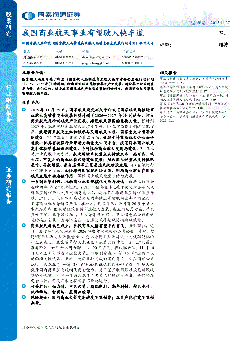 军工行业:国泰海通证券-军工行业国家航天局印发《国家航天局推进商业航天高质量安全发展行动计划》事件点评:我国商业航天事业有望驶入快车道-251127