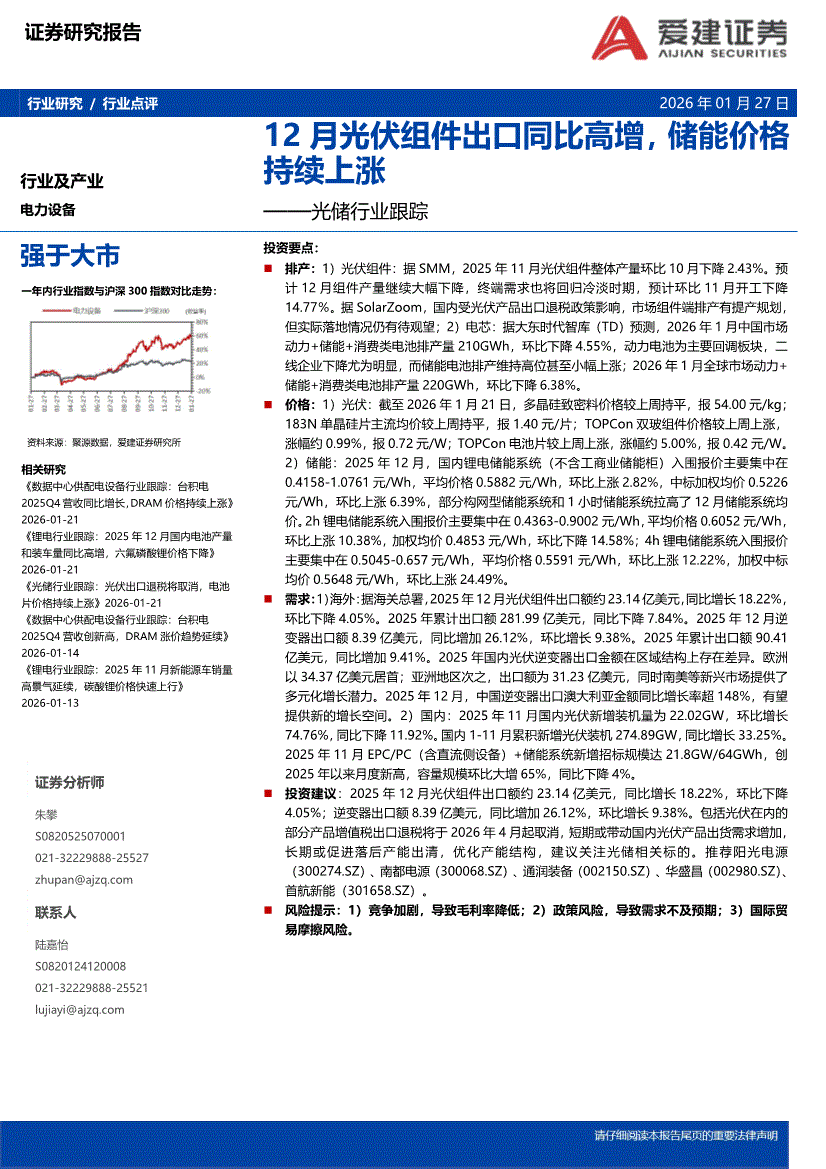 光储行业:爱建证券-光储行业跟踪:12月光伏组件出口同比高增,储能价格持续上涨-260127