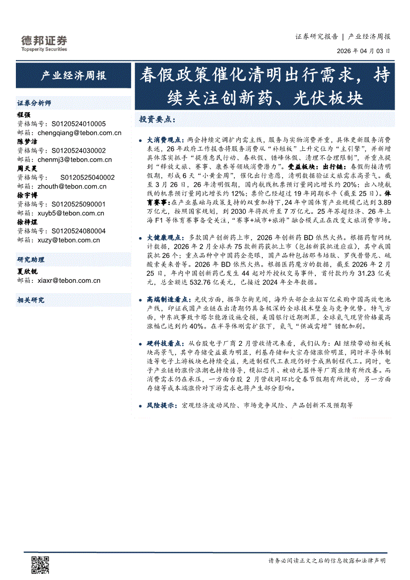 德邦证券-产业经济周报:春假政策催化清明出行需求,持续关注创新药、光伏板块-260403