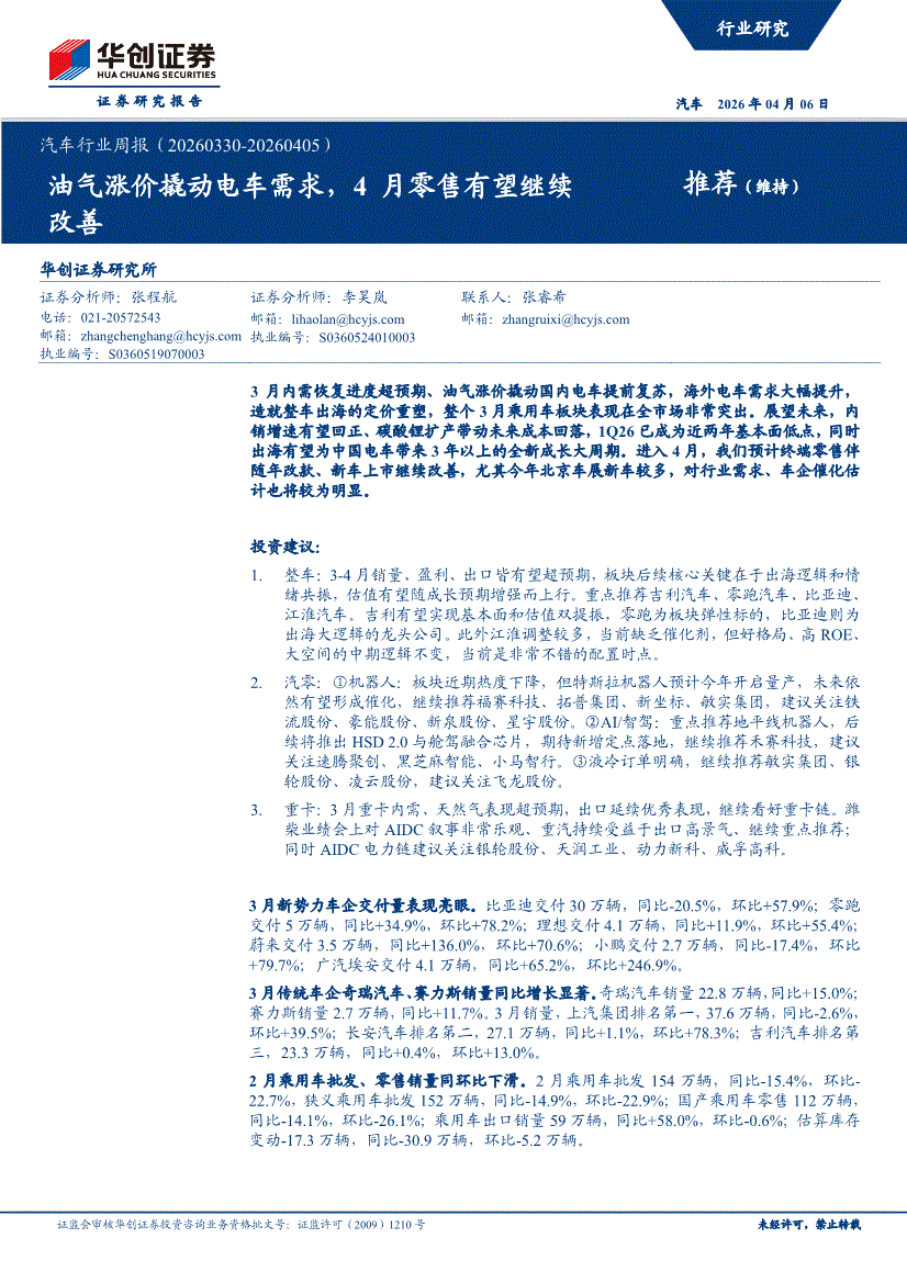 汽车行业:华创证券-汽车行业周报:油气涨价撬动电车需求,4月零售有望继续改善-260406