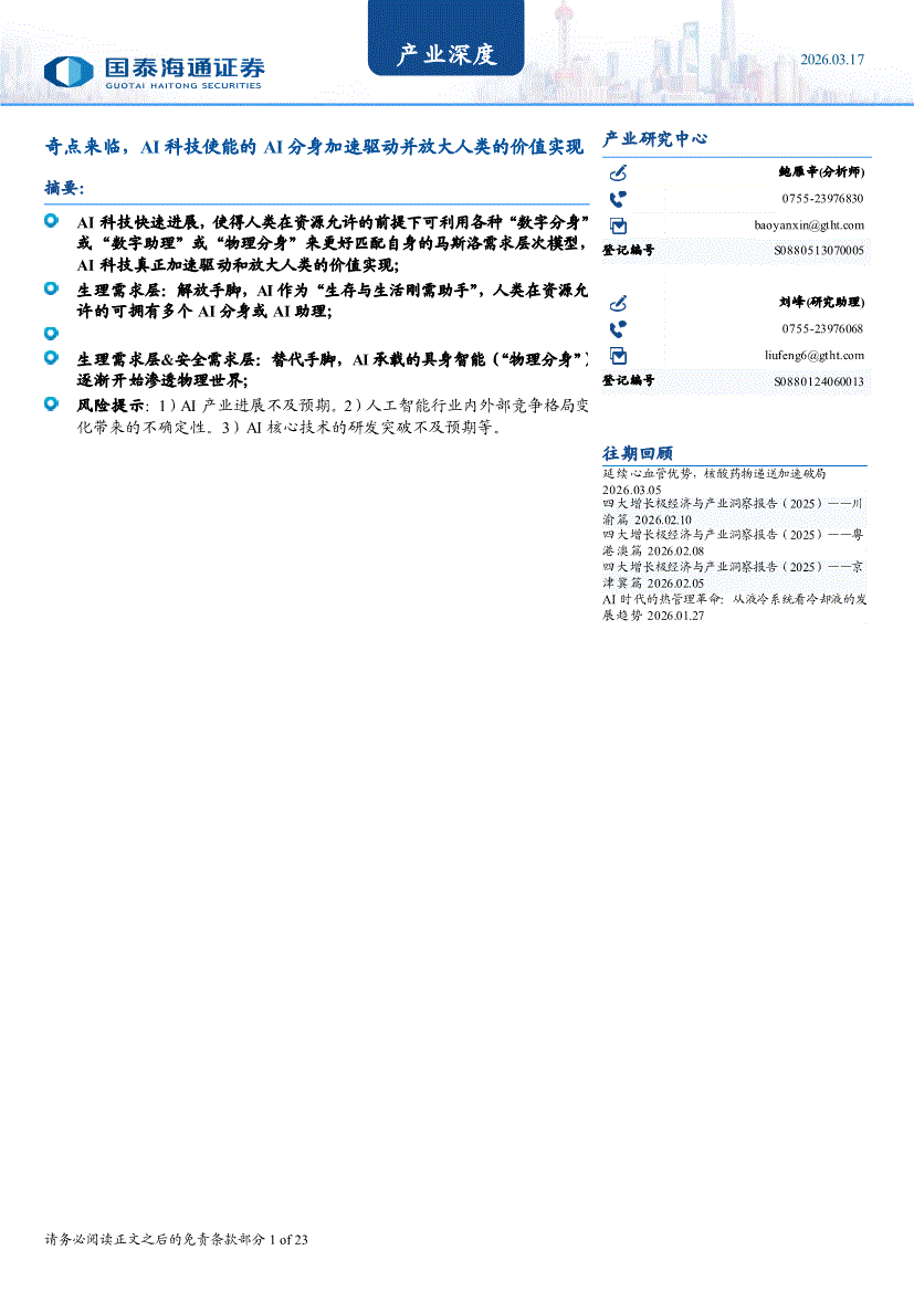 国泰海通证券-产业深度:奇点来临,AI科技使能的AI分身加速驱动并放大人类的价值实现-260317
