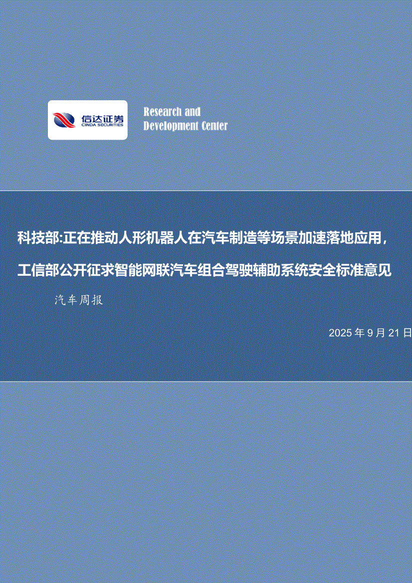 汽车行业:信达证券-汽车行业周报:科技部,正在推动人形机器人在汽车制造等场景加速落地应用,工信部公开征求智能网联汽车组合驾驶辅助系统安全标准意见-250921