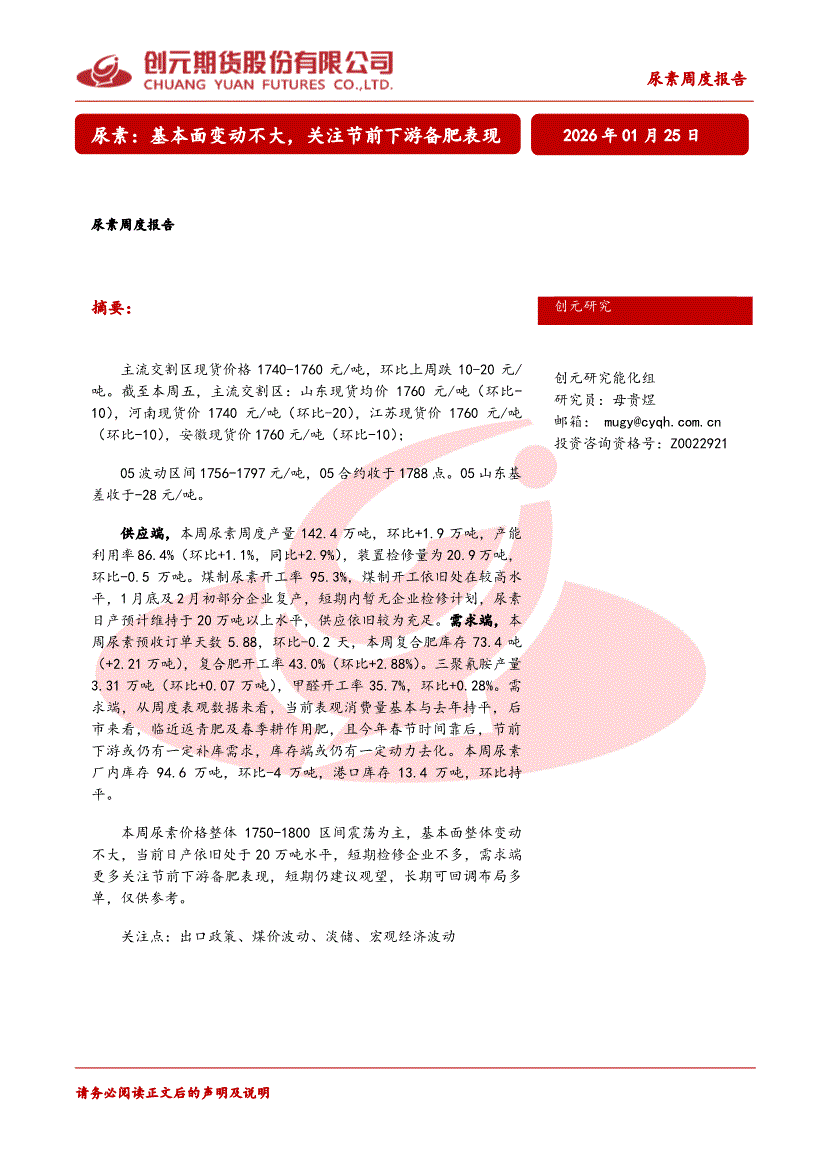 创元期货-尿素周度报告:尿素,基本面变动不大,关注节前下游备肥表现-260125