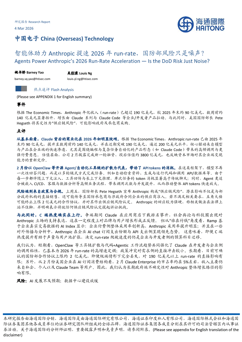 电子行业:海通国际-中国电子行业:能体助力Anthropic提速2026年run~rate,国防部风险只是噪声?-260304