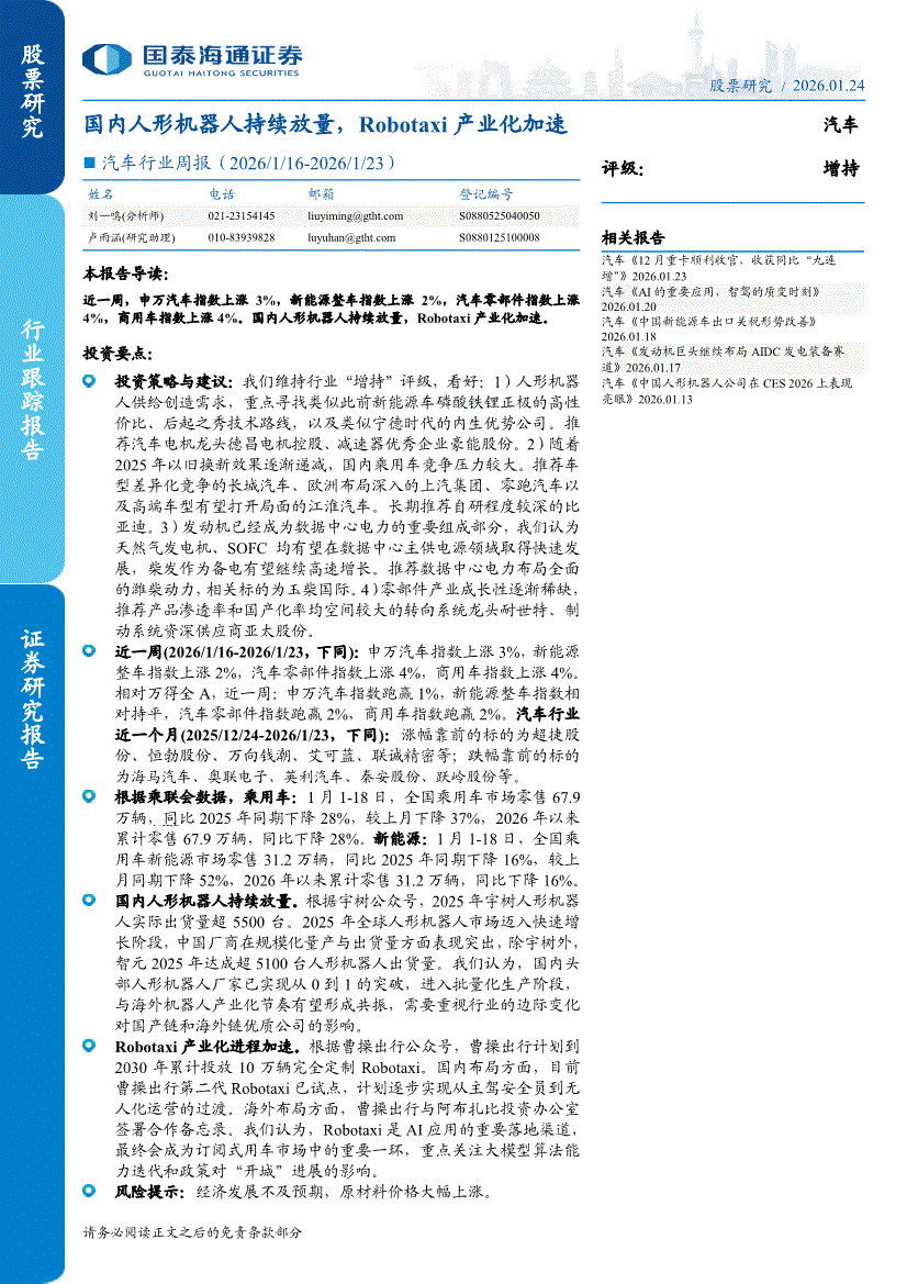 汽车行业:国泰海通证券-汽车行业周报:国内人形机器人持续放量,Robotaxi产业化加速-260124