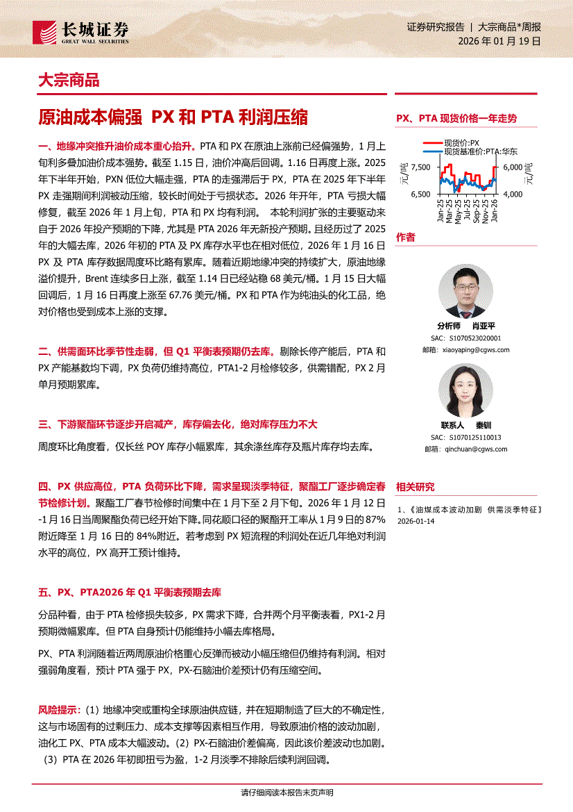 长城证券-大宗商品周报:原油成本偏强,PX和PTA利润压缩-260119
