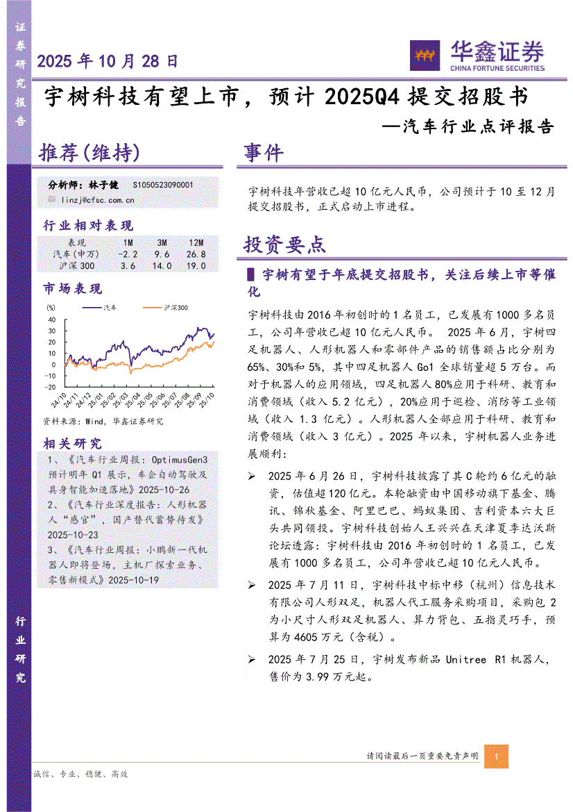 汽车行业:华安证券-汽车行业点评报告:宇树科技有望上市,预计2025Q4提交招股书-251028