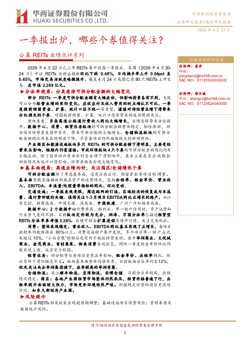 华西证券-公募REITs业绩点评系列:一季报出炉,哪些个券值得关注?-260427