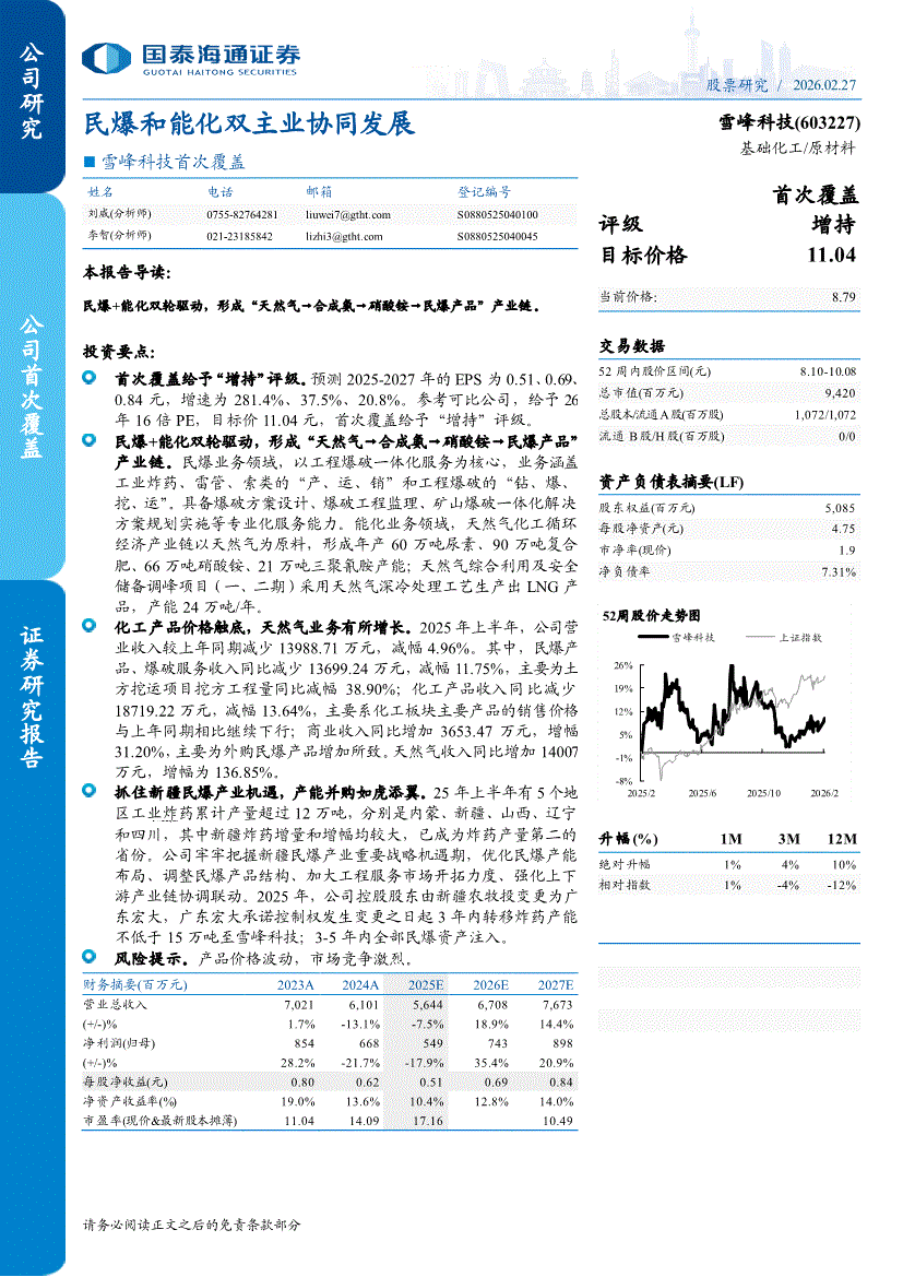 雪峰科技:国泰海通证券-雪峰科技-603227-首次覆盖:民爆和能化双主业协同发展-260227
