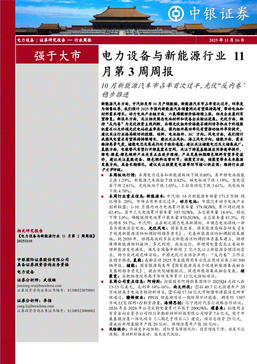电力设备与新能源行业:中银国际-电力设备与新能源行业11月第3周周报:10月新能源汽车市占率首次过半,光伏“反内卷”稳步推进-251116