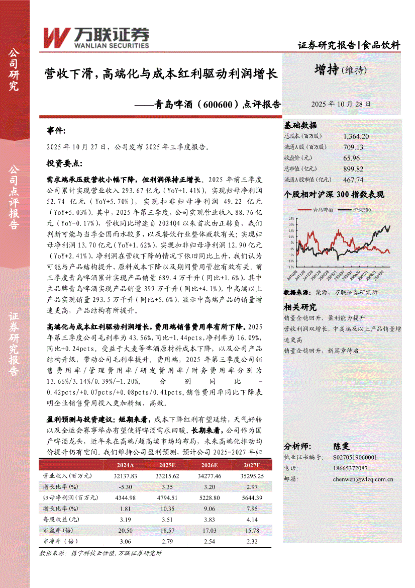 青岛啤酒:万联证券-青岛啤酒-600600-点评报告:营收下滑,高端化与成本红利驱动利润增长-251028