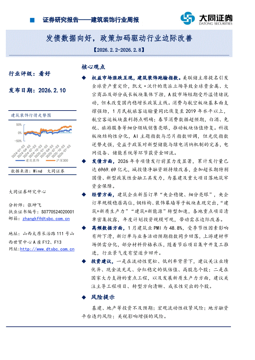 建筑装饰行业:大同证券-建筑装饰行业周报:发债数据向好,政策加码驱动行业边际改善-260210
