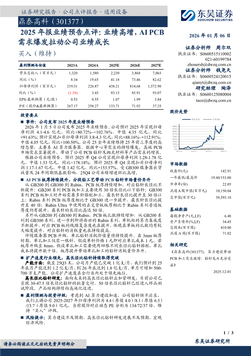 鼎泰高科:东吴证券-鼎泰高科-301377-2025年报业绩预告点评:业绩高增,AI PCB需求爆发拉动公司业绩成长-260106