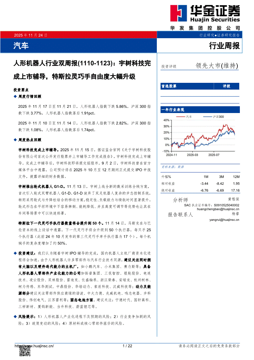 人形机器人行业:华金证券-人形机器人行业双周报(1110~1123):宇树科技完成上市辅导,特斯拉灵巧手自由度大幅升级-251124