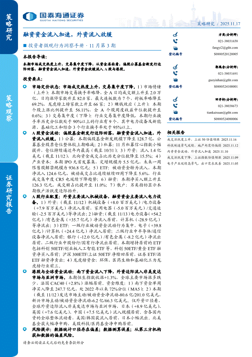 国泰海通证券-投资者微观行为洞察手册·11月第3期:融资资金流入加速,外资流入放缓-251117