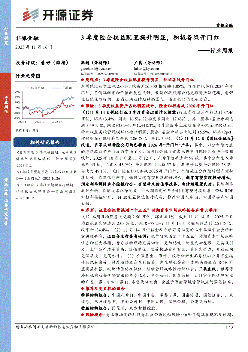 非银金融行业:开源证券-非银金融行业周报:3季度险企权益配置提升明显,积极备战开门红-251116