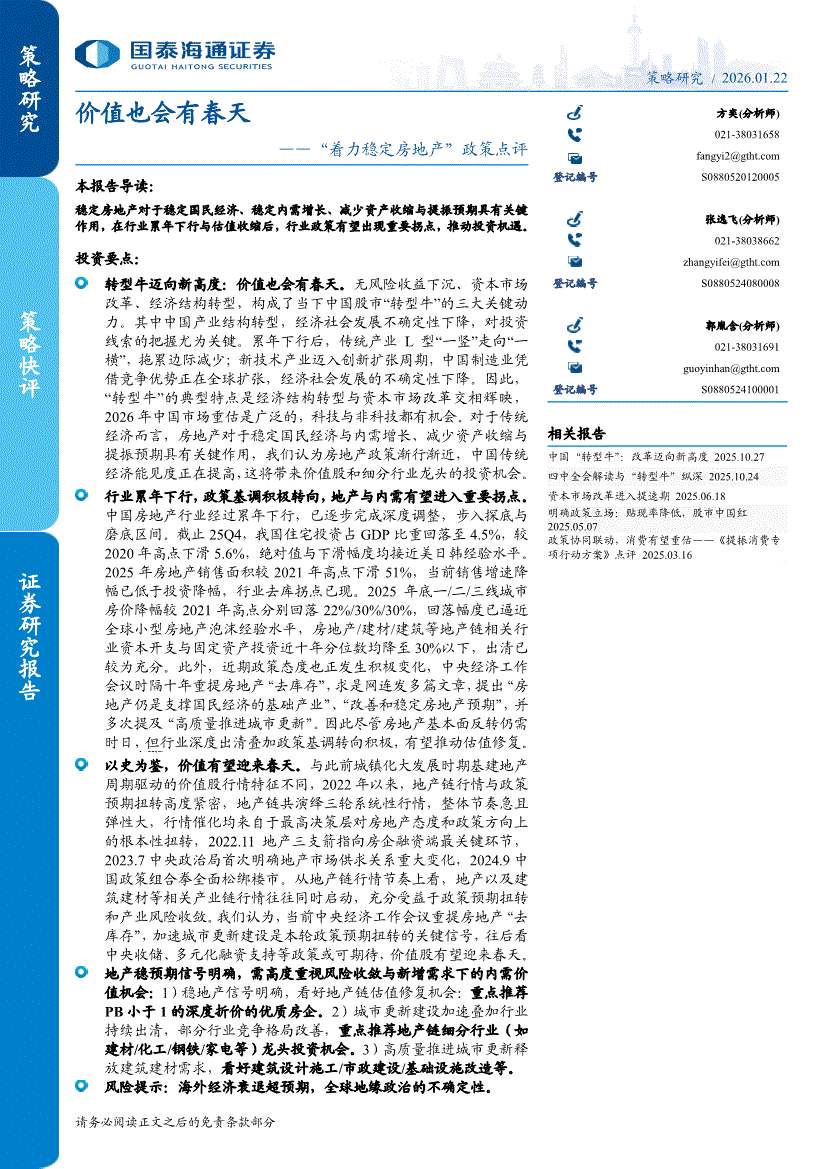 国泰海通证券-价值也会有春天——“着力稳定房地产”政策点评-260122