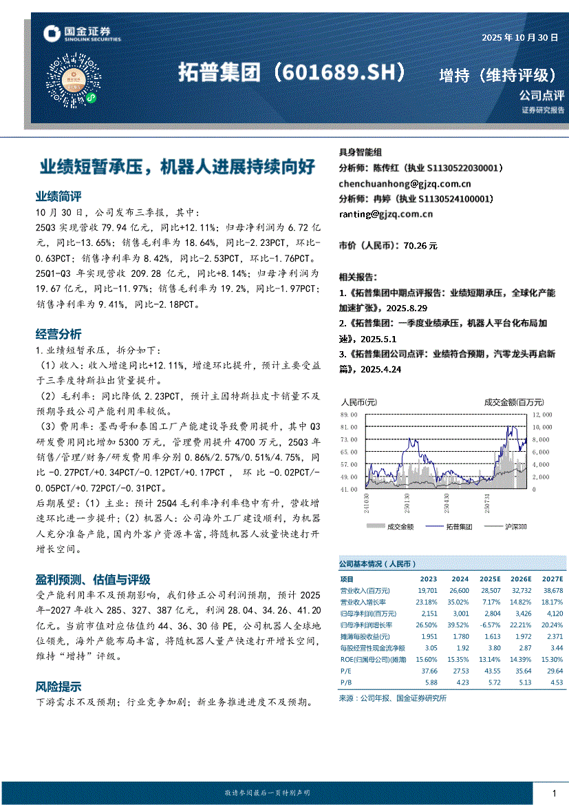 拓普集团:国金证券-拓普集团-601689-业绩短暂承压,机器人进展持续向好-251030