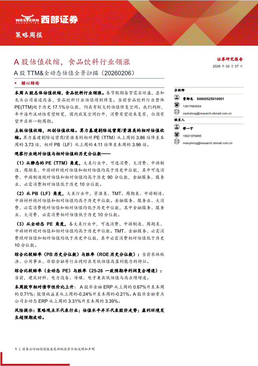 西部证券-A股TTM&全动态估值全景扫描:A股估值收缩,食品饮料行业领涨-260207