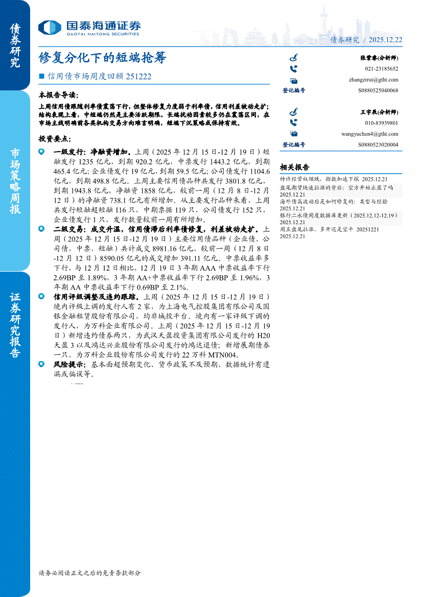 国泰海通证券-信用债市场周度回顾:修复分化下的短端抢筹-251222