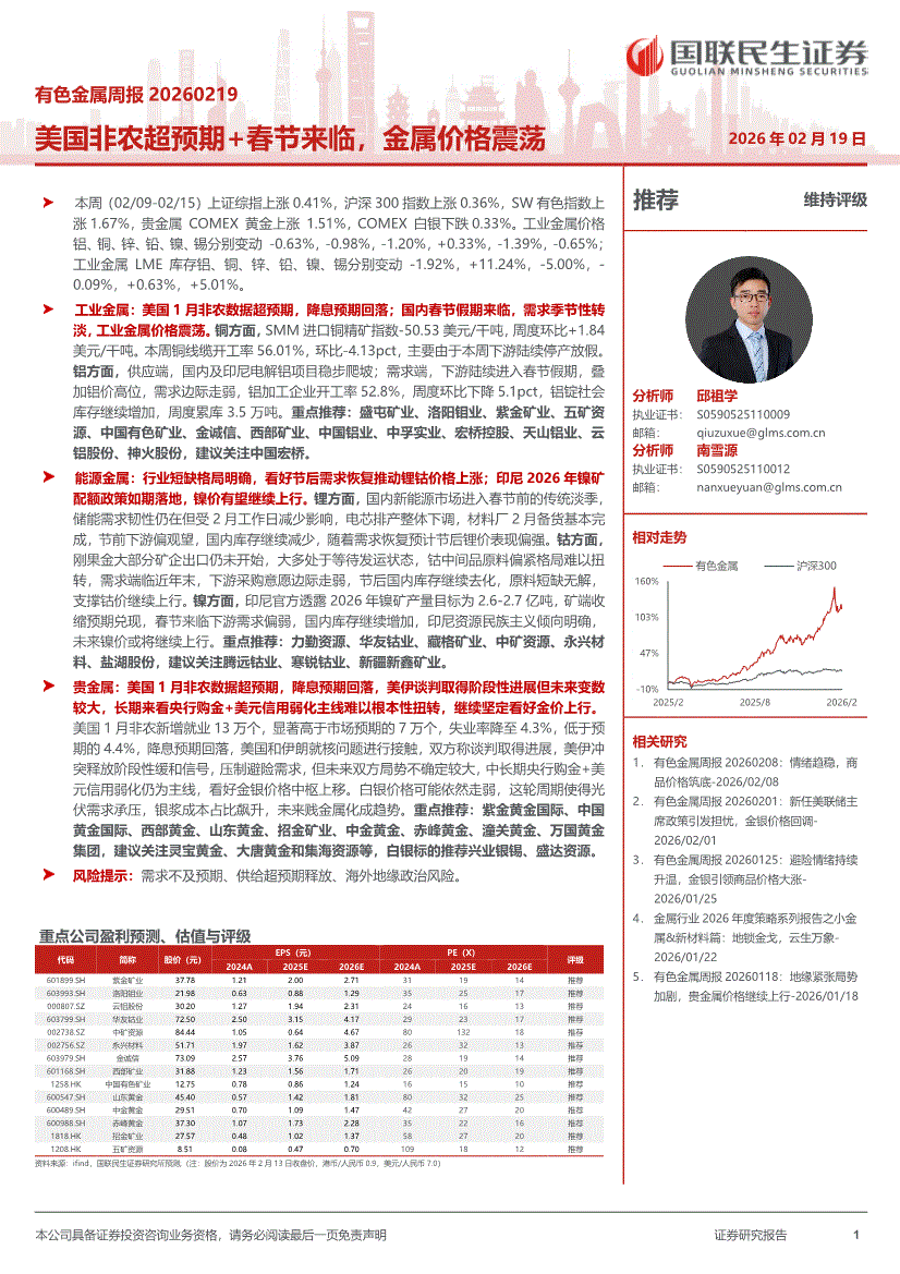 国联民生证券-有色金属行业周报:美国非农超预期+春节来临,金属价格震荡-260219