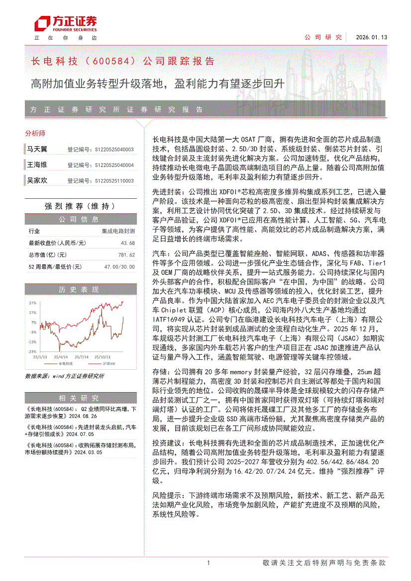 方正证券-长电科技-600584-公司跟踪报告:高附加值业务转型升级落地,盈利能力有望逐步回升-260113