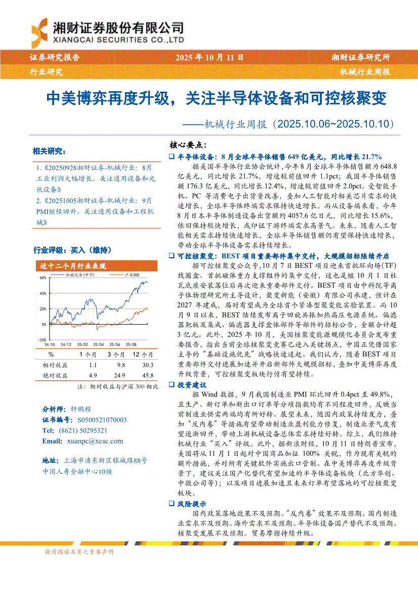 机械行业:湘财证券-机械行业周报:中美博弈再度升级,关注半导体设备和可控核聚变-251011
