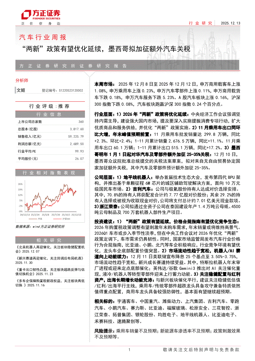 汽车行业:方正证券-汽车行业周报:“两新”政策有望优化延续,墨西哥拟加征额外汽车关税-251213