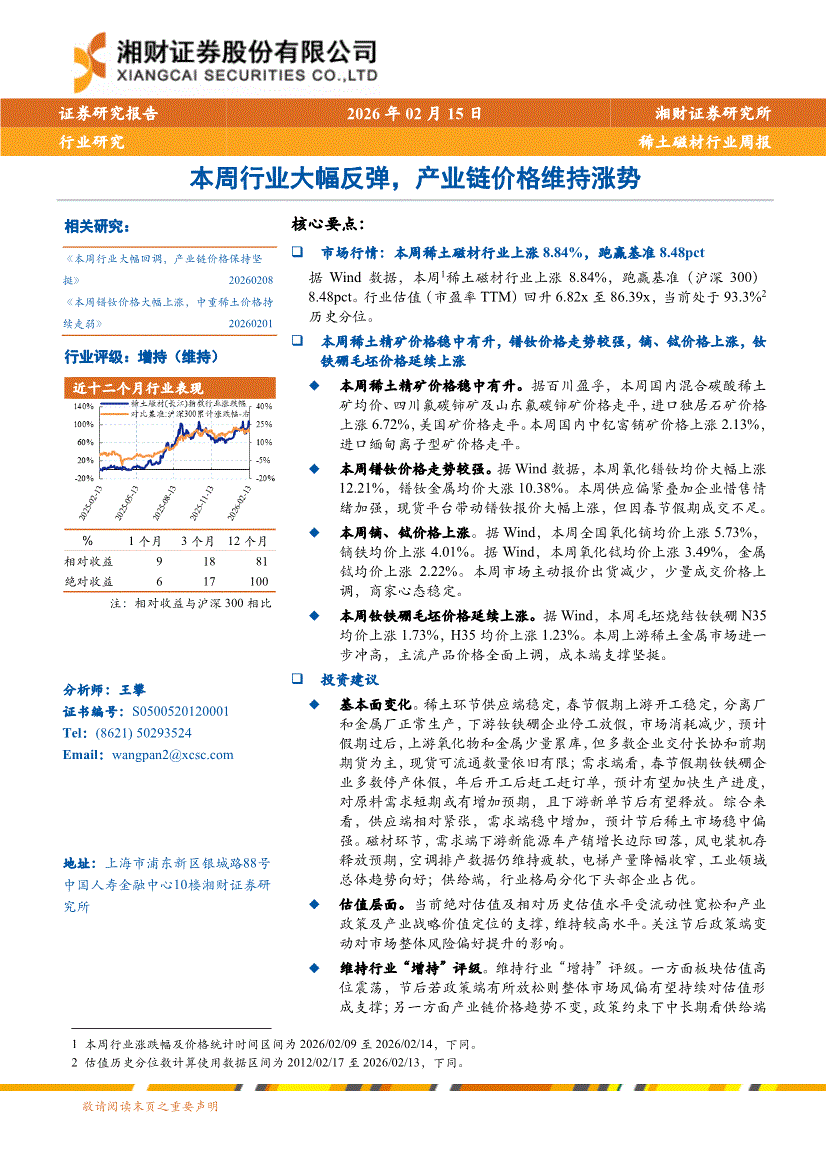稀土磁材行业:湘财证券-稀土磁材行业周报:本周行业大幅反弹,产业链价格维持涨势-260215