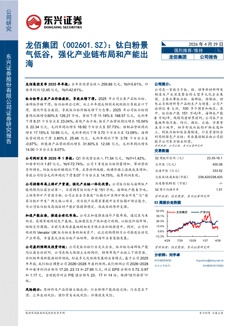 东兴证券-龙佰集团-002601-钛白粉景气低谷,强化产业链布局和产能出海-260429