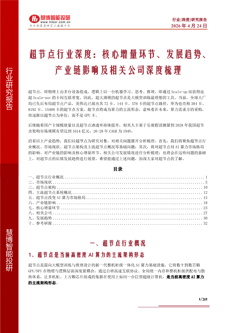 超节点行业:慧博智能投研-超节点行业深度:核心增量环节、发展趋势、产业链影响及相关公司深度梳理-260424