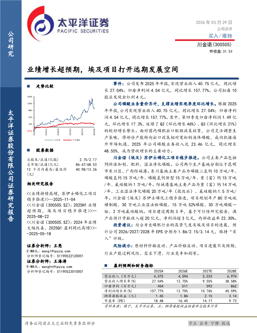 太平洋证券-川金诺-300505-业绩增长超预期,埃及项目打开远期发展空间-260329