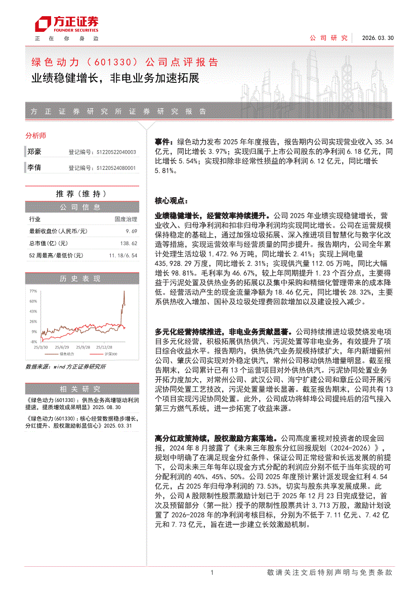 绿色动力:方正证券-绿色动力-601330-公司点评报告:业绩稳健增长,非电业务加速拓展-260330